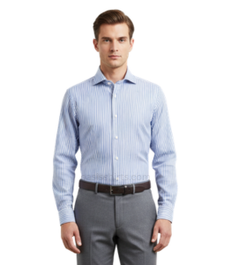 Blue striped shirt, spread collar, long sleeves with buttoned cuffs, full buttoned placket at the front, yoke on the back, curved hem