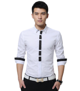 Enquiry for Private LabelSupreme designer shirt range like this one can create magic instantly. A true style makeover is what you seek for with this awesome all white shirt which has a dash of black panels on front button placard and a band of black running along inner panel cuffs, adding instantly to its magical fervor. Defined collar, long, full sleeves and designer buttons make it a statement collection, never to be missed. Available for bulk purchase at wholesale rates from Oasis Shirts, reputed manufacturer!