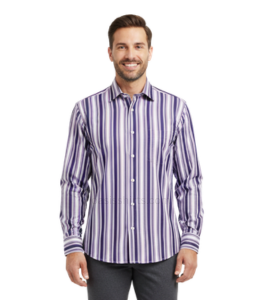 Purple diaognal striped shirt, spread collar, long sleeves with buttoned cuffs, full buttoned placket at the front, yoke on the back, curved hem